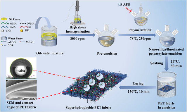 555 | Design of Bioinspired Highly Efficient, Eco-friendly, and Self-adhesive Emulsion for Superhydrophobic Polyester Fabrics | | |