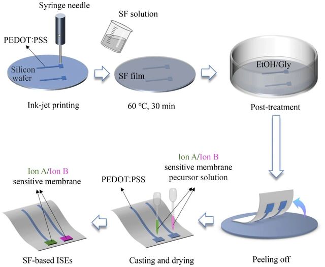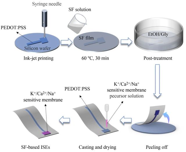 研究者首先基于柔性SF薄膜,分别成功构筑了可识别K⁺, Ca²⁺, Na⁺的单一离子响应型柔性离子选择性神经电极(制备流程见图1)。该电极的核心部位由SF薄膜、PEDOT导电层、离子选择性功能层构成的“三明治”结构组成。