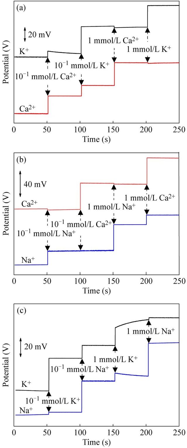以K⁺, Ca²⁺集成式离子选择性电极为例(图4(a)),第0~50 s测试的初始电解液为去离子水。之后,每间隔50 s向电解液中加入一定量的KCl或CaCl₂,使电解液中的K⁺或Ca²⁺浓度达到预设值(见图4(a)标注)。结果表明,当加入Ca²⁺时,集成电极中的Ca²⁺通道会产生明显升高的电势响应;而此时的K⁺通道仅会产生极小幅度的电位变化。当进一步向体系中添加K⁺后,集成电极中的Ca²⁺通道仅会产生极小幅度的电位变化;而此时的K⁺通道会产生明显的电势升高响应。综合来看,干扰离子引起的电位变化不足目标离子引起电位变化的10%,可以忽略不计。由此可见,K⁺, Ca²⁺双通道集成式离子选择性电极可同时有效检测体系中两种离子的浓度变化。Ca²⁺, Na⁺选择性电极和Na⁺, K⁺选择性电极的离子响应性能见图4(b)、4(c),综合结果呈现类似规律。综上,三种集成电极的两个通道均可精准响应两种目标离子,且通道之间无信号串扰。