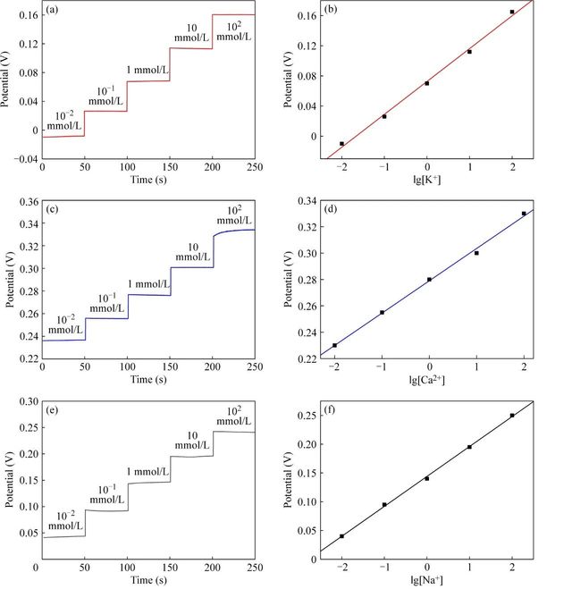 单通道电极对特征离子的响应结果如图2所示。根据电势随时间(特征离子浓度变化)响应的曲线(图2(a)、2(c)、2(e)),计算出电势随相应浓度的对数变化的电压拟合曲线,即校准曲线,见图2(b)、2(d)、2(f))。进一步的计算结果表明,三种离子选择性电极均可对不同浓度的目标离子进行响应,K⁺选择性电极的灵敏度为43.6 mV/dec,Ca²⁺选择性电极的灵敏度为27.9 mV/dec,Na⁺选择性电极的灵敏度为52.1 mV/dec。三种单通道电极的检测区域均为10⁻²~10² mmol/L,基本覆盖了脑脊液中的特征离子浓度范围。