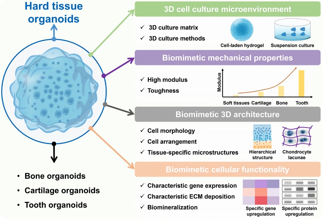 硬组织(骨、软骨、牙齿)是维持机体力学完整性与生理功能的核心组分,其自修复能力有限,传统临床修复策略面临供体短缺、免疫排斥等瓶颈。类器官作为可精准复刻组织或器官结构与功能的三维体外模型,为硬组织修复与再生提供了全新解决方案。然而,天然硬组织结构复杂、力学性能优异,体外模拟与复刻难度大,导致理想的硬组织类器官构建面临诸多难题。