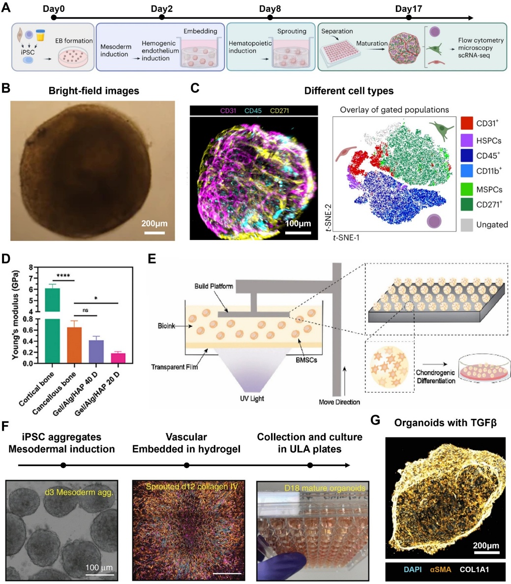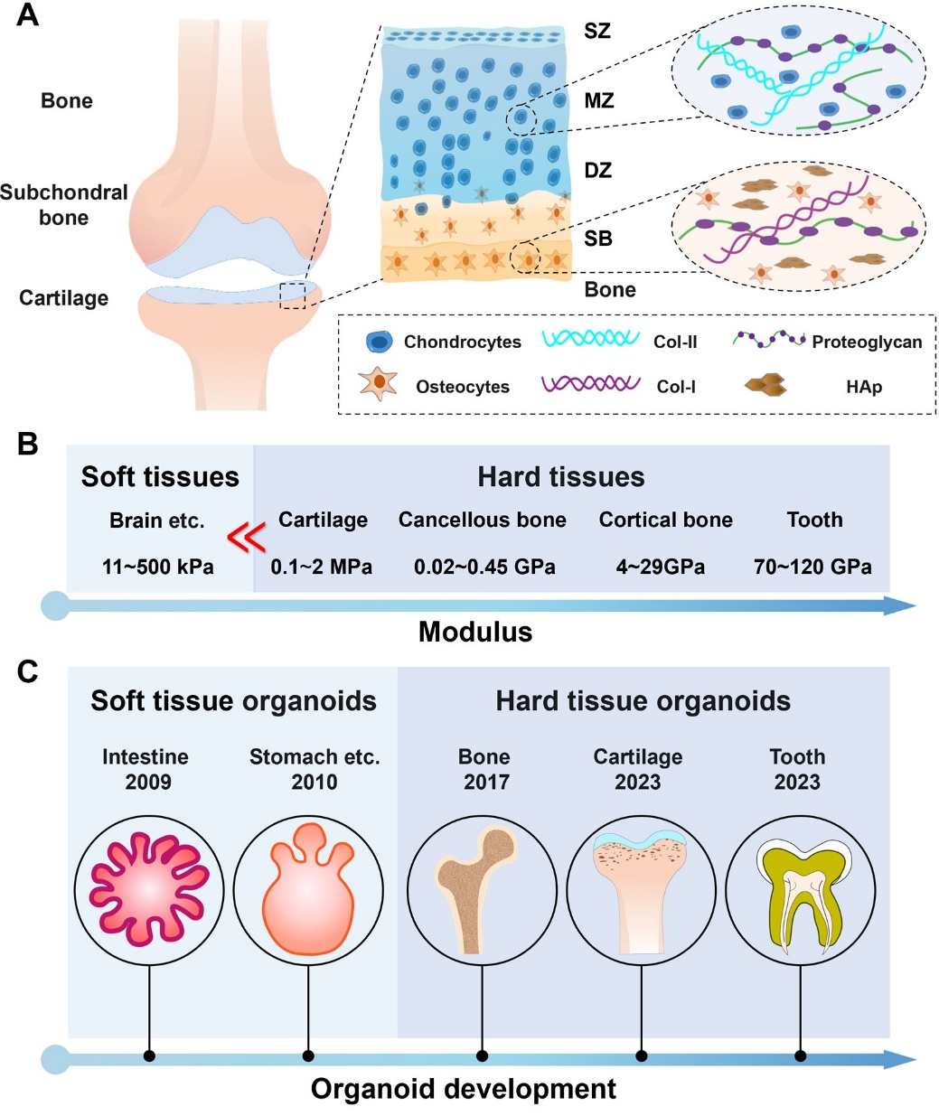(A)骨/软骨组织的层级结构和细胞外基质特征。(B)软组织和硬组织的弹性模量比较。(C)类器官的发展历程:从软组织到硬组织。