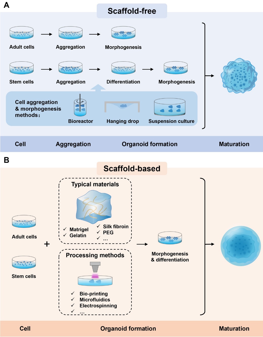 图3. 类器官的典型设计与构建策略。(A)无支架体系。(B)有支架体系。