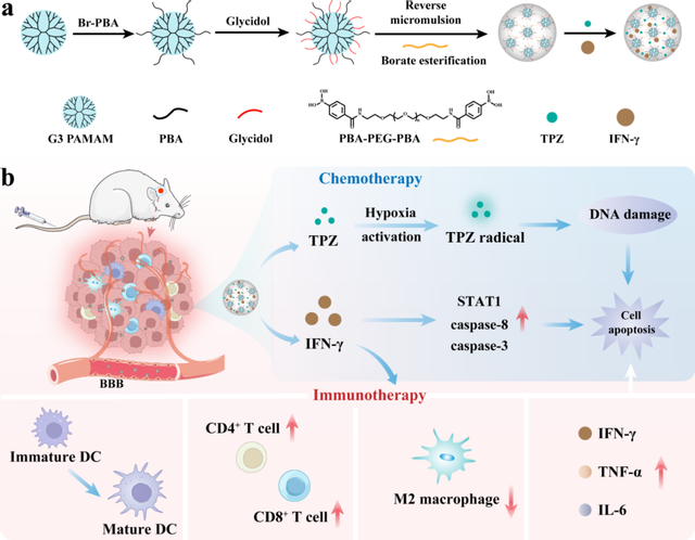 Hydroxylated dendrimer nanogels co-deliver drugs and cytokines for chemoimmunotherapy of glioma
