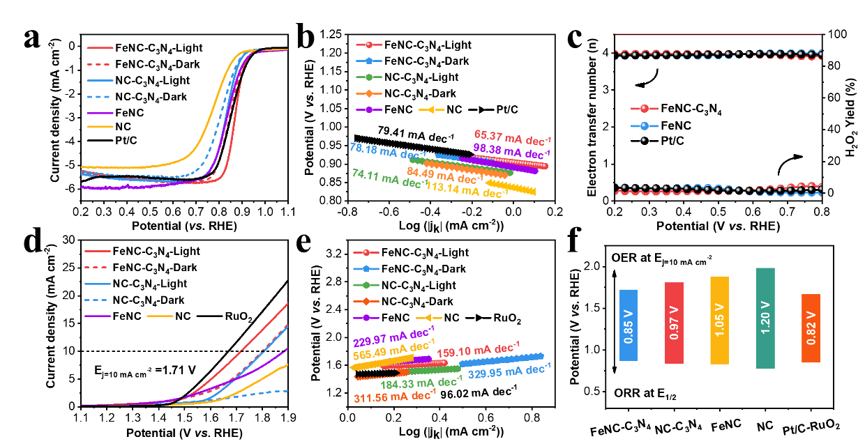 Figure 2 (a) LSV curves for ORR of FeNC-C3N4, NC-C3N4, FeNC, NC and Pt/C in O2-saturated 0.1 M KOH with a rotating rate of 1600 rpm. (b) Corresponding Tafel plots for ORR on FeNC-C3N4, NC-C3N4, FeNC, NC and Pt/C. (c) The H2O2 yield and electron transfer number of FeNC-C3N4, FeNC and Pt/C in O2-saturated 0.1 M KOH. (d) LSV curves for OER of FeNC-C3N4, NC-C3N4, FeNC, NC and RuO2. (e) Corresponding Tafel plots for OER on FeNC-C3N4, NC-C3N4, FeNC, NC and RuO2. (f) Potential gap (Ej=10 – E1/2) of FeNC-C3N4, NC-C3N4, FeNC, NC and RuO2 under illumination.