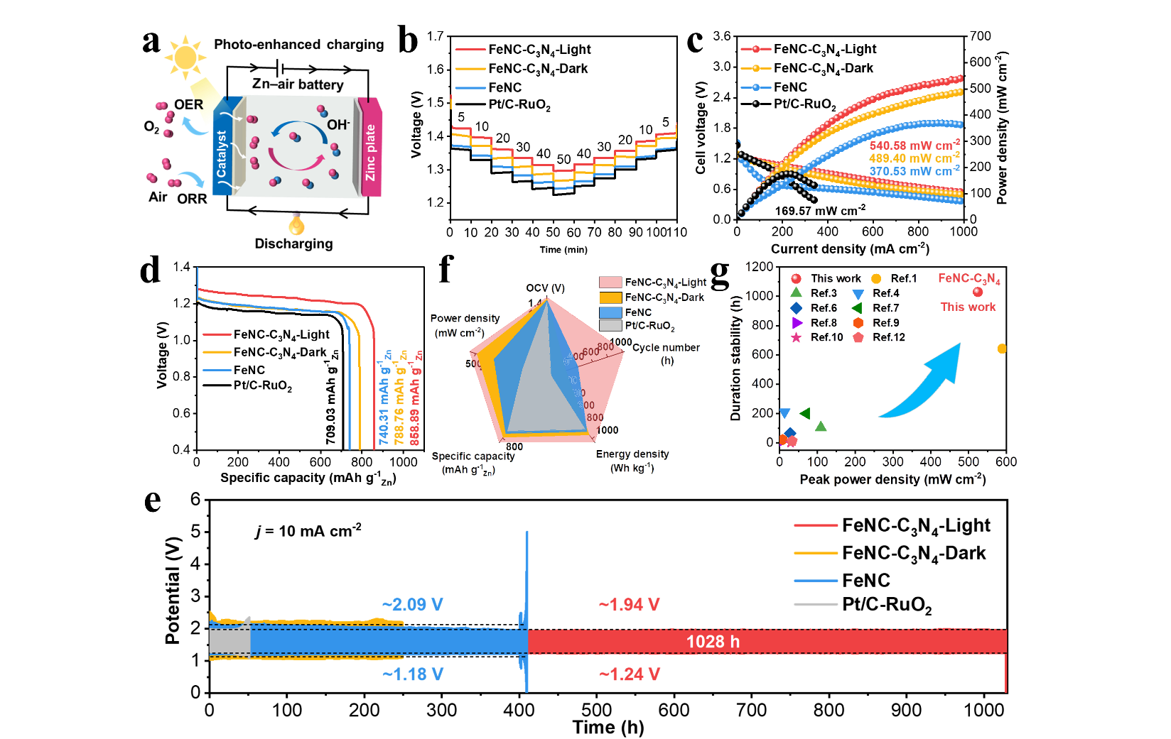 将先进的光电催化剂集成到空气电极上,能够开发出太阳能利用率更高的光-增强锌-空气电池(PZABs),有效解决了传统锌-空气电池系统充电过电位高的难题。通过将具有优异物理化学特性(包括极低电阻率、卓越导电性和超大比表面积)的介孔碳锚Fe SACs与g-C3N4构建高效的肖特基异质结,可实现FeNC-C3N4光电催化剂的合理设计。通过利用光生载流子来调ORR/OER的反应动力学,基于FeNC-C3N4的PZABs有望在光照条件下实现降低充电电压或提高放电电压的目标。