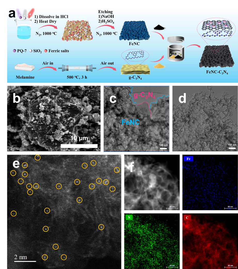 Figure 1 (a) Schematic illustration of the synthesis for FeNC-C3N4. (b) SEM images of FeNC-C3N4. TEM images of (c) FeNC-C3N4 and (d) FeNC. (e) AC HAADF-STEM image of FeNC-C3N4. (f) HAADF-STEM image of FeNC-C3N4 and corresponding EDX elemental mappings.